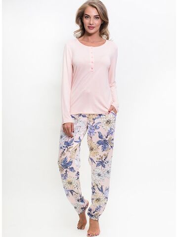 Комплект с брюками и блузоном. Блузон с однотонным длинным рукавом, до линии груди планка на пяти пуговицах. Брюки прямого покроя в цветочную расцветку, с вшивными карманами. В комплекте: блузон, брюки.