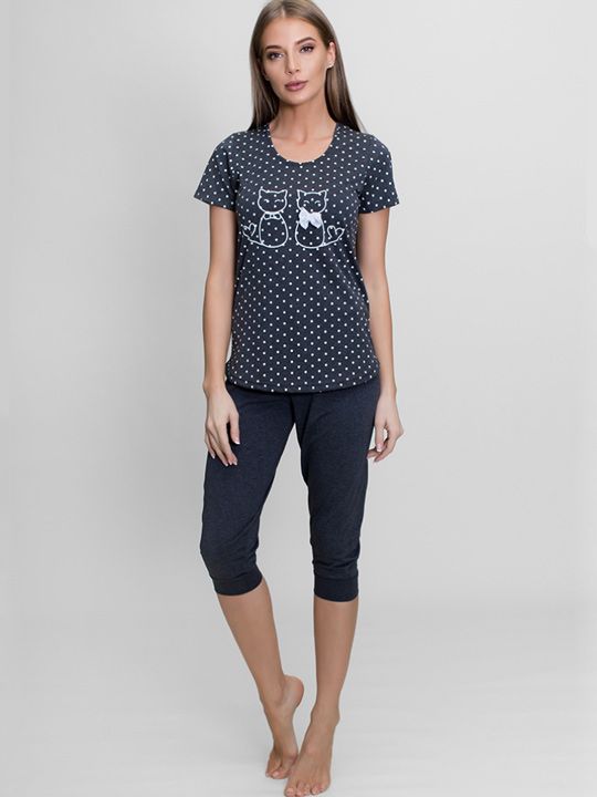 Трикотажный комплект. Футболка с коротким рукавом, из однотонной ткани с принтом, капри облегающего покроя. В комплекте: футболка, капри.