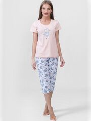 Трикотажный комплект. Футболка с коротким рукавом из однотонной ткани, впереди с принтом, капри прямого покроя с рисунком. В комплекте: футболка, капри.