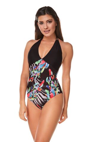 Слитный купальник-халтер с глубоким V-образным вырезом и с мягкими плавающими вкладышами. Верх купальника фиксируется завязками, спинка открытая. Изделие декорировано ярким принтом. Внимание: европейские размеры! Для определения российского размера необходимо прибавить 6!