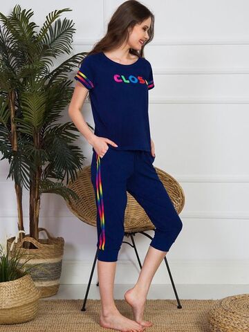 Трикотажный комплект из однотонной ткани: капри и футболкой с коротким рукавом с принтом впереди. В комплекте: футболка, капри.
