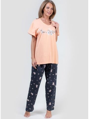Трикотажный комплект. Футболка с коротким рукавом из однотонной ткани, впереди с принтом, брюки прямого покроя с рисунком. В комплекте: футболка, брюки.