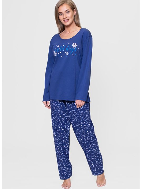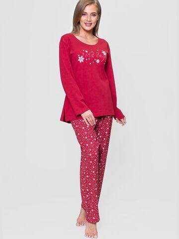Трикотажный байковый комплект. Футболка с длинным рукавом, однотонная, впереди с принтом, брюки прямого покроя с рисунком. В комплекте: футболка, брюки.