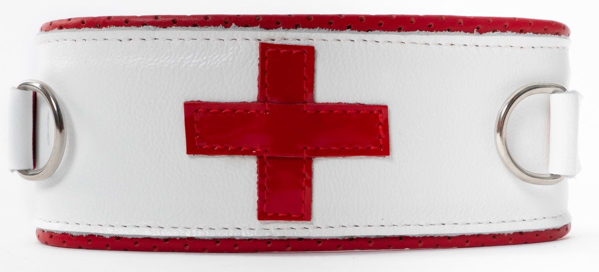 Ошейник изготовлен из искусственной кожи. Декорирован медицинским крестом и кольцами по бокам.