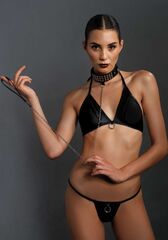Стильный ошейник из эко-кожи, декорированный металлическими заклёпками. Имеет несъёмный металлический поводок с удобной петлёй для руки. Внимание:белье на модели в комплект не входит!