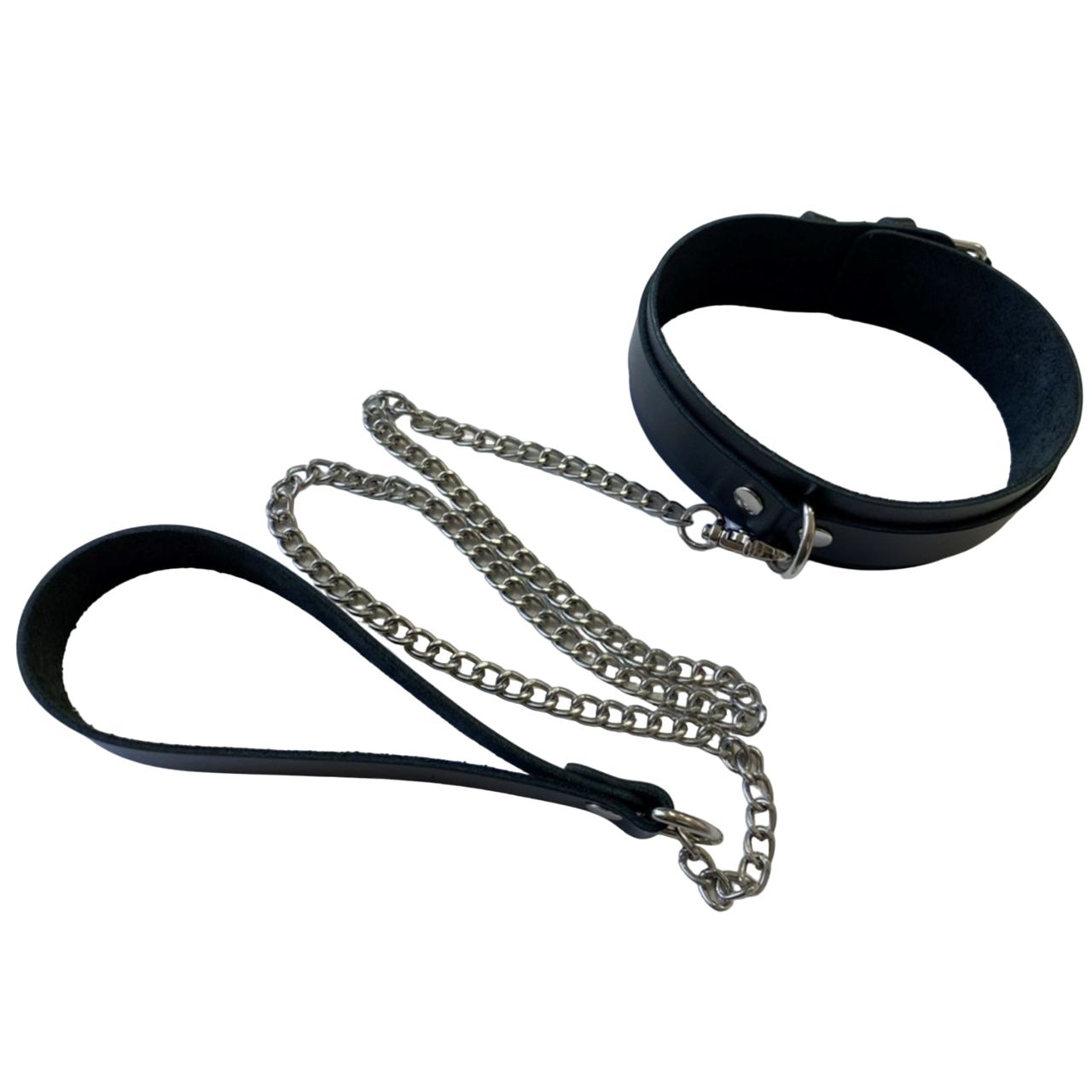 Ошейник стильной формы, единый отрез натуральной кожи и металлическое кольцо для поводка в центре.