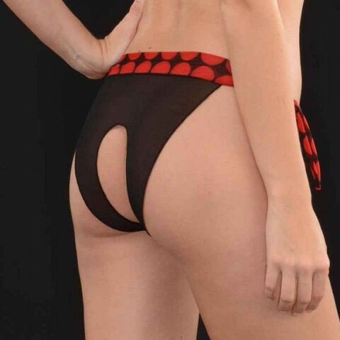 Откровенные трусы-танга для женщин с открытыми ягодицами. Трусики имеют завязки по бокам, спереди небольшой бантик. Скомбинированы из двух видов ткани - полупрозрачной и в контрастный горох.