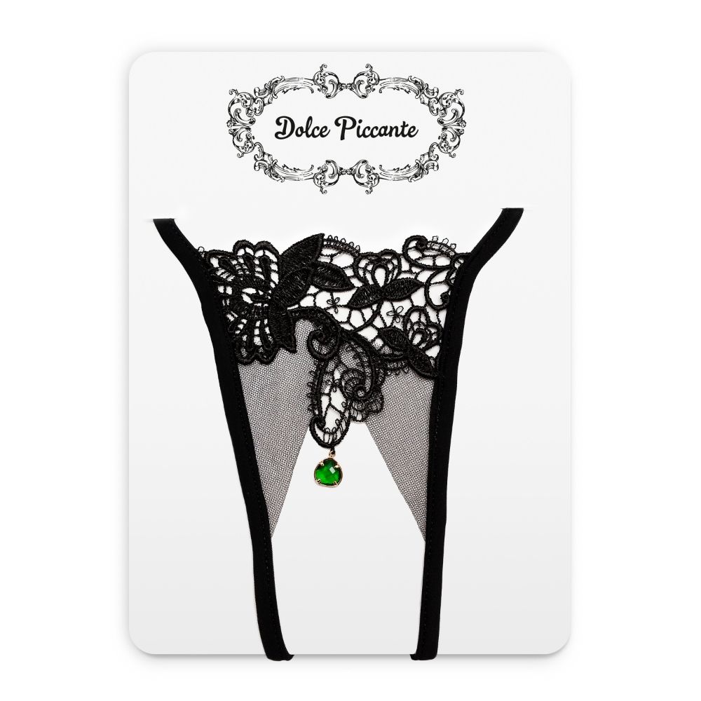 Маленький зеленый камешек, в полумраке спальни поблескивающий на черном кружеве. Тонкие тесемки на изящных бедрах. Очаровательные трусики в которых все открыто для ласк. Чувственная красота белья. Невесомое белье от бренда Dolce Piccante. Французское кружево Экрю. Ручная работа. Лимитированный тираж.