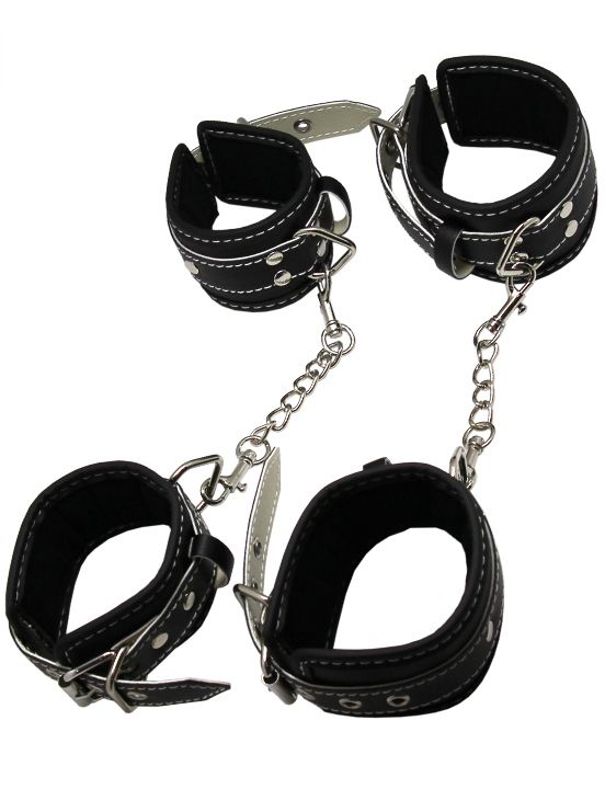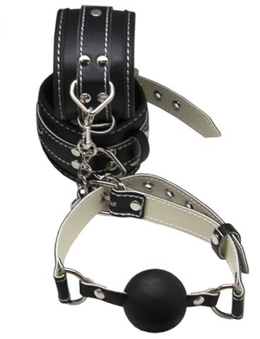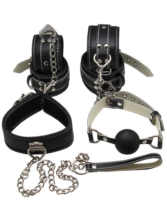 Высококачественные изделия с современной фурнитурой, аккуратными креплениями и отличной контрастной белой строчкой. Изготавливаются из натуральной кожи c покрытием, которое сохраняет свойство натуральной кожи пропускать воздух и устойчивость к деформации, но в отличии от натуральной кожи имеет более привлекательный внешний вид. Наручники, поножи и ошейник сшиты на велюровой подкладке. Между слоем кожи и велюровой подкладкой проложена дополнительно мягкая прокладка для более комфортного использования в БДСМ-играх. Наручники, а также поножи, соединяются между собой короткой цепочкой с двумя карабинами на концах. Поводок (цепь) крепится к кольцу ошейника карабином и оснащен кожаной петлёй для руки. Классический пластиковый кляп-шар на кожаных ремешках удобно помещается во рту, свободно перемещаясь по ремешку. Все размеры — универсальные. В комплекте: наручники, поножи, ошейник с поводком, кляп.
