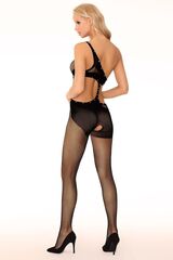 Экстравагантный боди-комбинезон на одно плечо. Выполнен плетением в сеточку и украшен декоративными элементами. Модель эффектно обнажает живот, поясницу и спину.