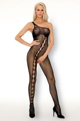 Комбинезон в мелкую сеточку с бретелью через одно плечо, вырез украшают стразы, сбоку рисунок в форме звездочек, украшен стразами.