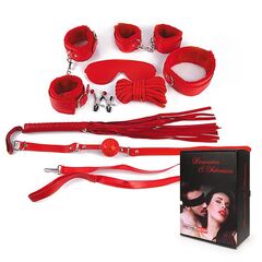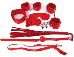 Великолепный набор аксессуаров для любителей БДСМ. В комплект входят наручники, оковы, маска, кляп, плеть, ошейник с поводком, верёвка, зажимы для сосков. Кляп, наручники, оковы, ошейник и маска снабжены специальной внутренней накладкой, предотвращающей натирание кожи. Также изделия имеют возможность регулирования размера. Плеть-флоггер состоит из хвостов и удобной рукоятки с металлическими вставками и петлей для подвешивания на крючок. Кляп оснащен шариком с отверстиями для дыхания. В комплекте: наручники, оковы, маска, кляп, плеть, ошейник с поводком, верёвка, зажимы для сосков.