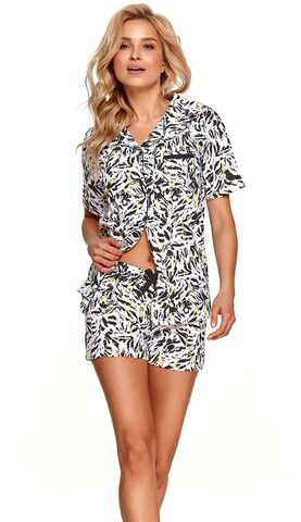 Женская пижама Amy выполнена из хлопкового полотна с анималистическим принтом. Комплект состоит из рубашки и шортиков. Рубашка с короткими рукавами, на груди накладной карман. Шорты на мягкой широкой резинке. Отличный вариант для сна и домашнего отдыха. В комплекте: рубашка, шорты.