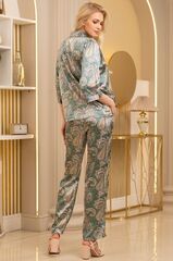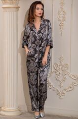 Комплект Donatella состоит из блузы и брюк, выполнен из принтованной смесовой ткани. Блуза на пуговицах с рукавом. По бокам брюк расположены карманы, а понизу разрезы. В комплекте: блузка, брюки.