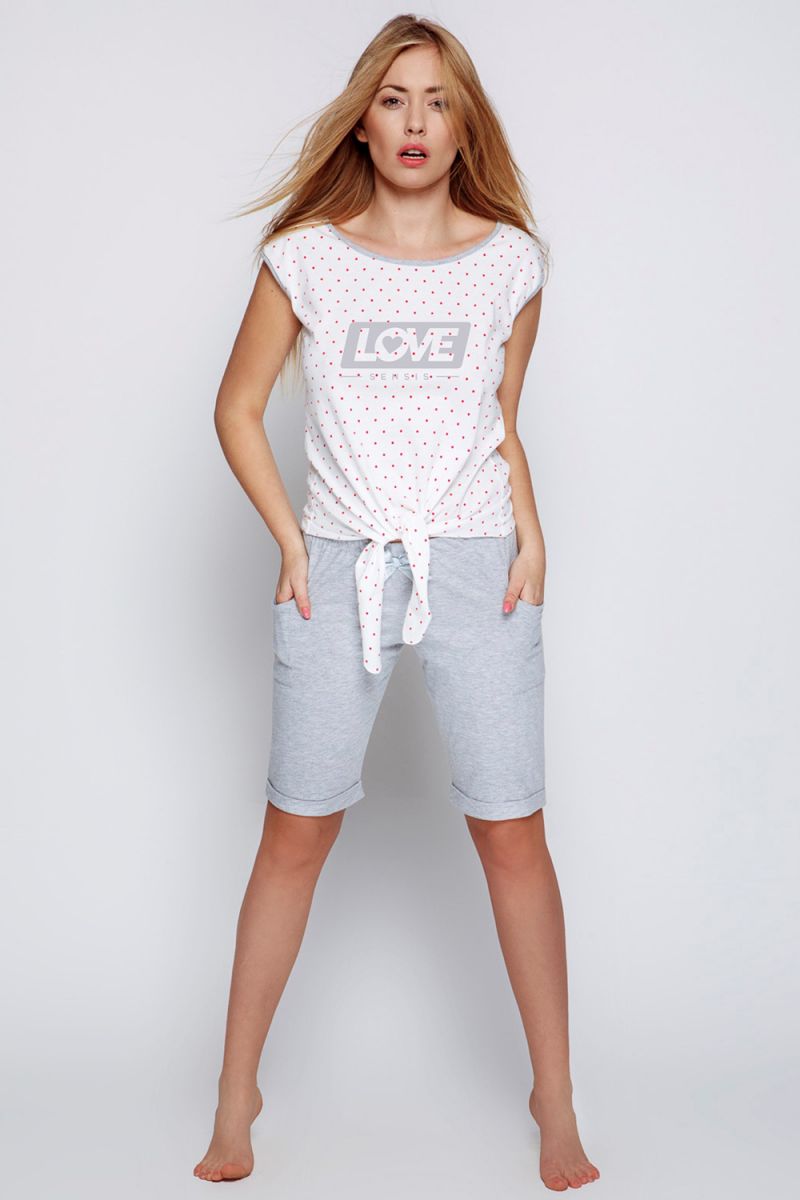 Хлопковая пижама Polina состоит из футболки свободного кроя с завязкой и бермудов. Футболка в мелкий красный горох, декорирована надписью на груди. Бермуды с карманами и атласным бантиком на поясе. В комплекте: футболка, шорты.