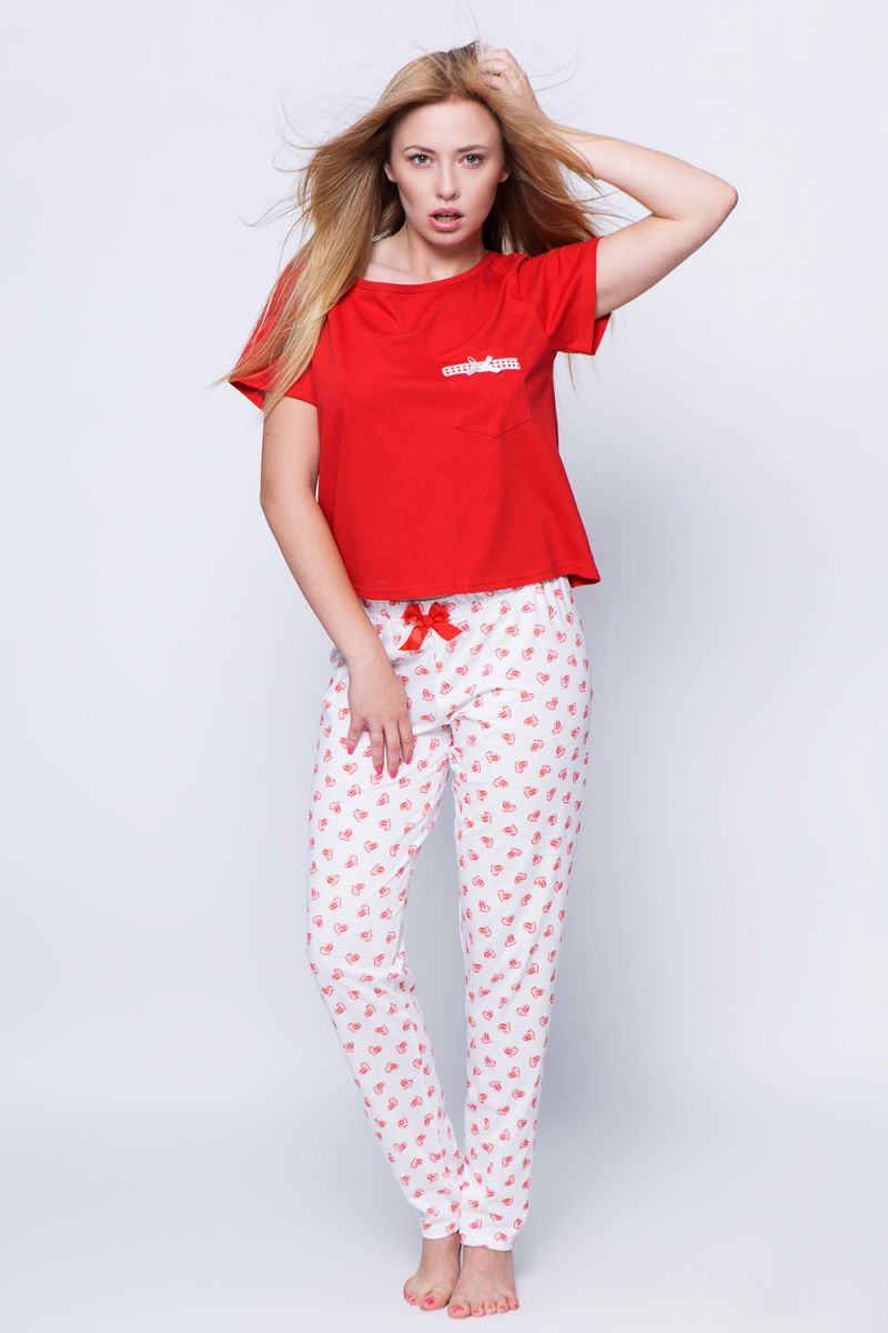 Молодежная пижама Tori состоит из футболки свободного кроя и штанов с манжетой-резинкой по низу. Футболка с нагрудным карманом. Штаны декорированы принтом сердечки . В комплекте: футболка, штаны.
