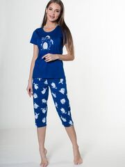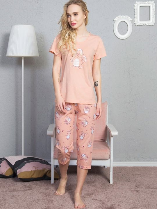 Трикотажная туника из однотонной ткани с коротким рукавом, с принтом впереди. И принтованные капри. В комплекте: футболка, капри.