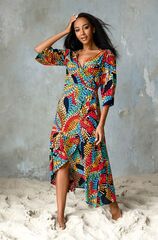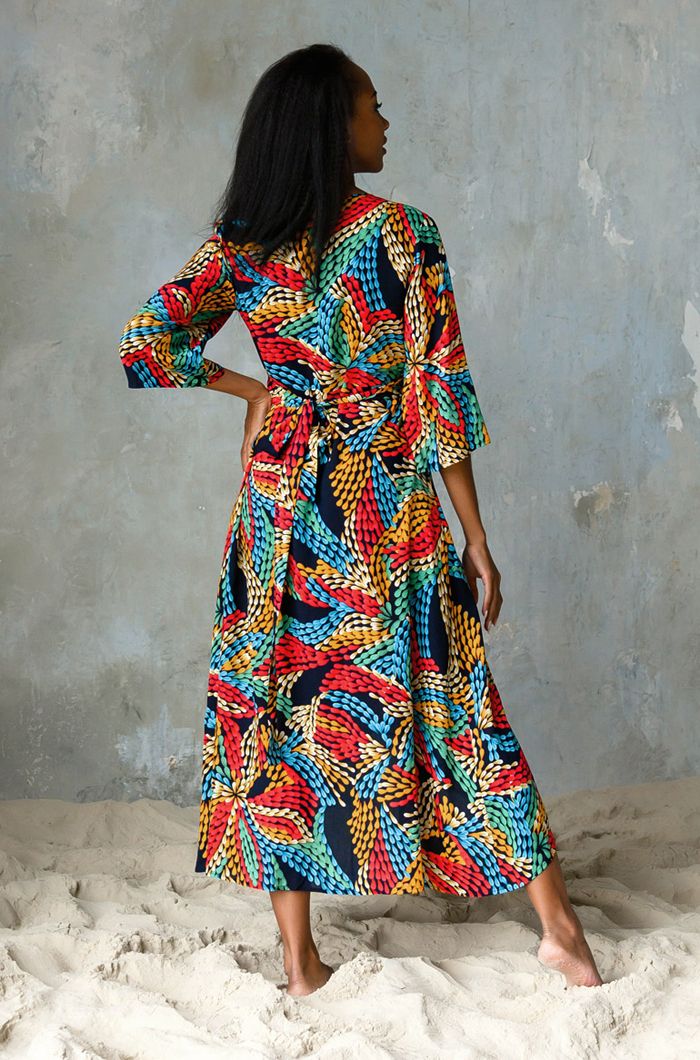 Платье выполнено из яркой принтованной вискозы. Модель приталенного силуэта на запах длиной макси. Платье с V-образным вырезом горловины. Рукав свободного силуэта длиной 3/4.