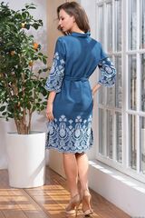 Платье Montana прямого силуэта из джинсового полотна с вышивкой, длиной до середины колен, с рукавами. V-образная горловина с отложным воротником и декоративной планкой на пуговицах, на груди декоративные защипы. Низ туники с двумя боковыми разрезами, в боковых швах карманы. Модель дополнена поясом для придания еще большей элегантности образу.