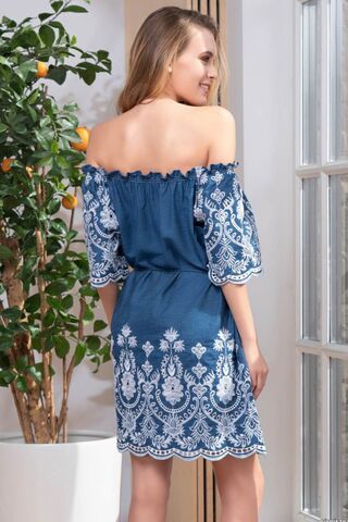 Платье Montana прямого силуэта с рукавами 3/4 из джинсового полотна с вышивкой. Длина выше колена, верх на резинке, за счет чего плечи могут быть открытыми или закрытыми. В боковых швах карманы. В комплект входит пояс-шнурок с металлическими наконечниками, чтобы подчеркнуть талию и добавить еще большей элегантности в образ.