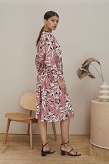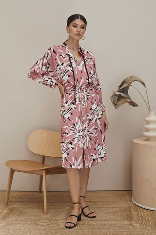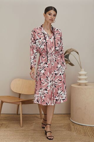 Платье средней длины на пуговицах. Красивый цветочный принт, воротник украшен необычной кулиской. На талии пояс, который отлично подчеркивает талию.