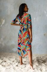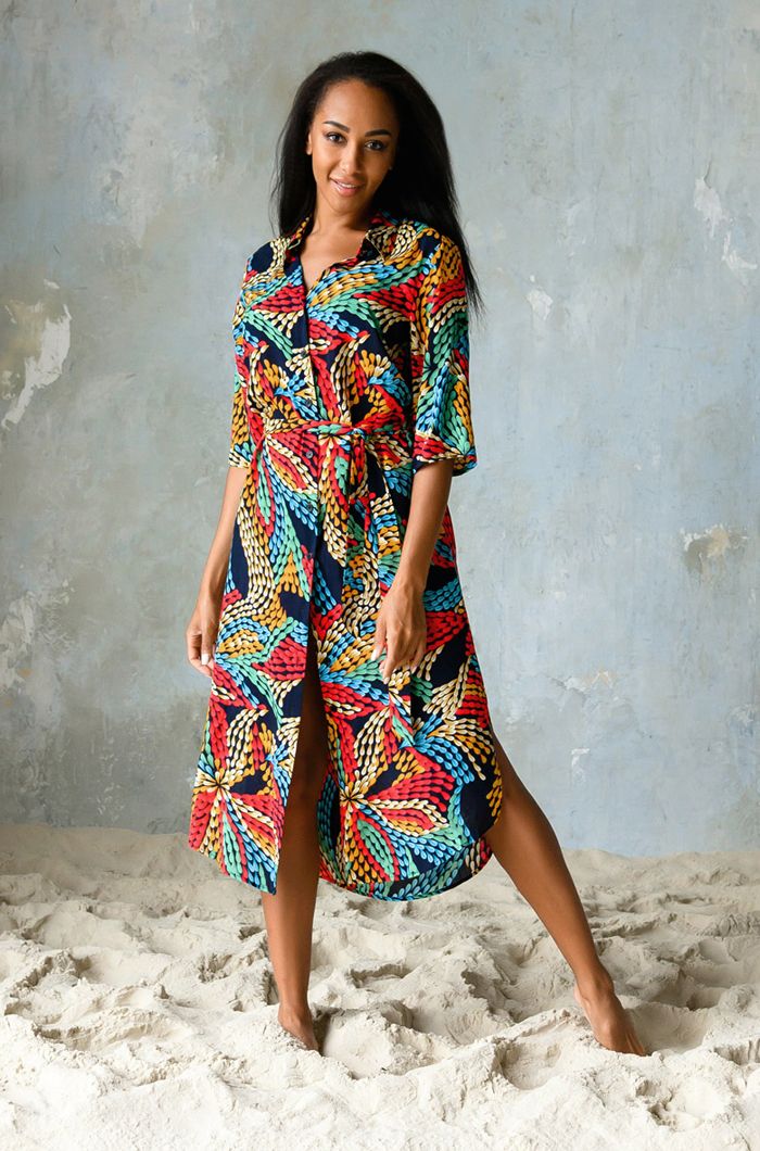 Платье-туника выполнено из яркой принтованной вискозы. Модель на поясе прямого силуэта длины миди. Туника рубашечного типа с воротником стойкой и планкой застежкой на пуговицах. Рукав прямой длиной 3/4.