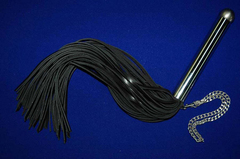 Плетка кожаная, 16-ти полосная (хромированная ручка и петля на руку). Используется для разогрева тела перед флагелляцией или может служить серьезным инструментом для коротких и сильных воздействий. Имеет большую площадь соприкосновения с телом, вследствие чего сила удара равномерно распределяется по всей площади контакта. Благодаря этому удар получается мягким и безопасным.