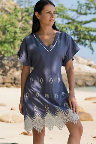 Туника свободного кроя, с коротким рукавом, c контрастной вышивкой, длиной чуть выше колен. В боковых швах расположены карманы. В комплекте - пояс с кисточками.