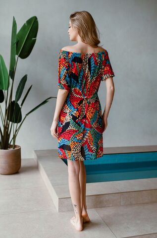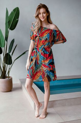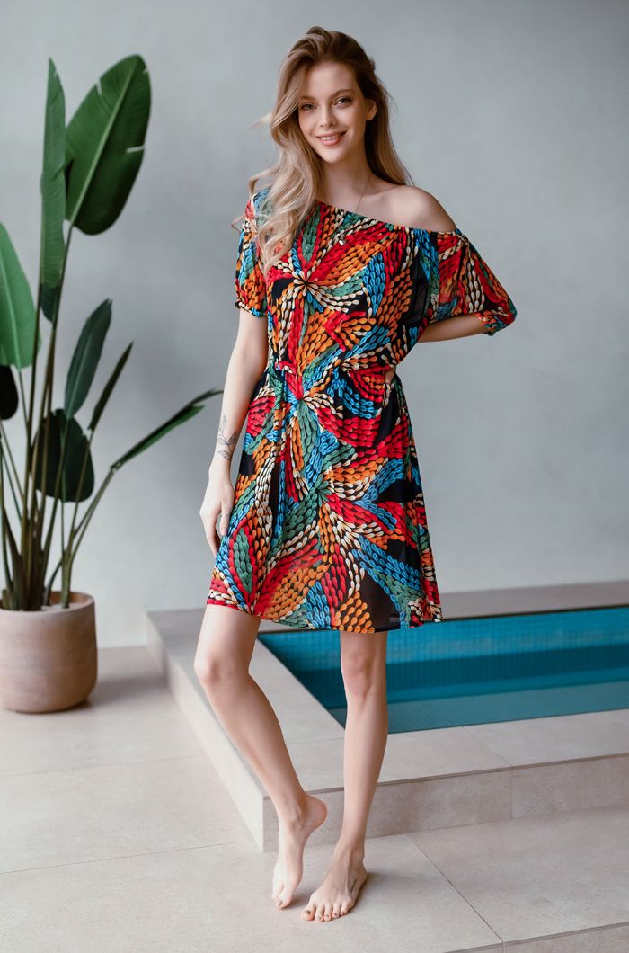 Туника пляжная женская выполнена из эластичной принтованной сетки. Модель приталенного силуэта длиной выше колена. По талии и по плечам изделия кулиска на резинке. Рукав короткий.