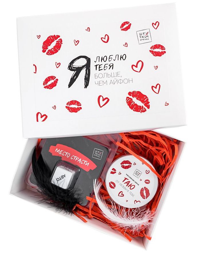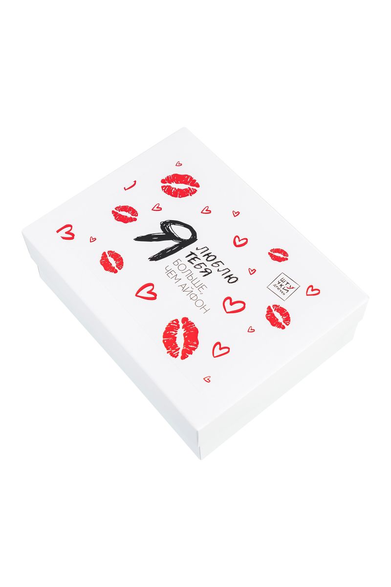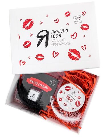 Не надо слов, подари бокс «Люблю тебя больше, чем айфон». Такой пикантный подарок заставит биться сердце вашей второй половинки ещё чаще! Удивите и удивляйтесь сами – содержание бокса остается в секрете, но мы попробуем намекнуть вам! Итак, в коробке содержится: штучка натуральная по содержанию, дарит свет в ночи и дает огня привычным ласкам; штучка-подсказка поможет выбрать, где вам со второй половинкой испытать невероятное удовольствие. Откройте секрет своих чувств вместе с боксом «Люблю тебя больше, чем айфон». В комплекте: игральные кубики «Место страсти», массажная свеча «Горячий шоколад».