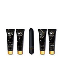 Коллекция миниатюрных изделий поможет вам изучить и нарушить все табу. Ничто так не разжигает желание,как исследование самых нежных уголков вашего тела соло или со своим партнером. В наборе: -Лубрикант на водной основе TOKO AQUA - 10 мл. -Гель для возбуждения клитора SECRET GARDEN - 7 мл. -Возбуждающий крем для влюбленных DRAGON - 7 мл. -Крем для возбуждения G-точки RAIN OF LOVE - 7 мл. -10-скоростная вибропуля .