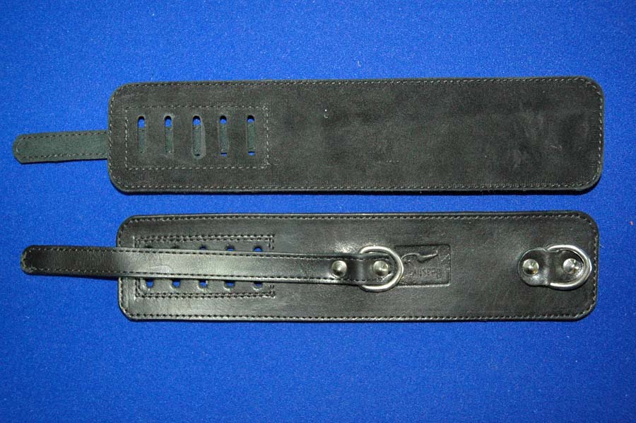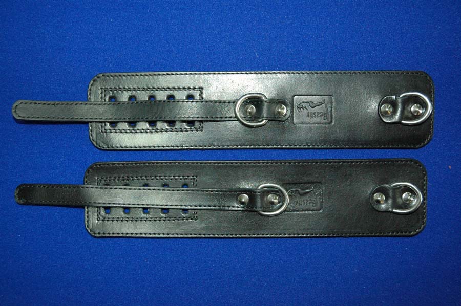 Наручники, подшитые черным велюром, со сварным D-кольцом, без соединительной фиксации, на застежке. Застежка D-кольцо и эллипсные прорези с фиксирующим ремешком, запирающаяся замочком для фиксации. Ширина наручников - 5,5 см.
