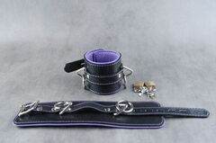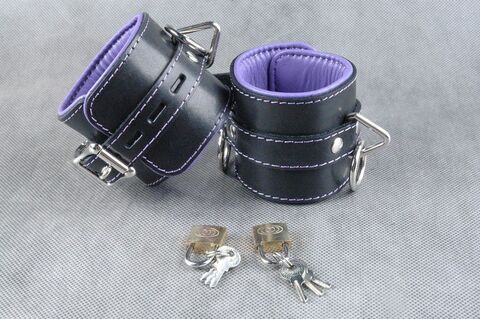 Подвернутые; застежка - ремешок с эллипсными отверстиями и запирающейся пряжкой «бабочкой», с замочком для фиксации. База с 2 треугольниками с кольцом, с мягкой проставкой внутри, обтянутой лиловой кожей с подворотом, без соединительной фиксации. Ширина - 6,5 см.