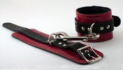 Наручники подвернутые, изнутри с мягкой проставкой обтянутой кожей с подворотом, для соединительной фиксации в комплектк двухсторонний карабин. База шириной 65 мм, со сварным D-кольцом по центру, закрепленным ремешком 25 мм, проходящим поверх базы. Застежка, с регулирующим размер ремешком. Ширина - 6,5 см.