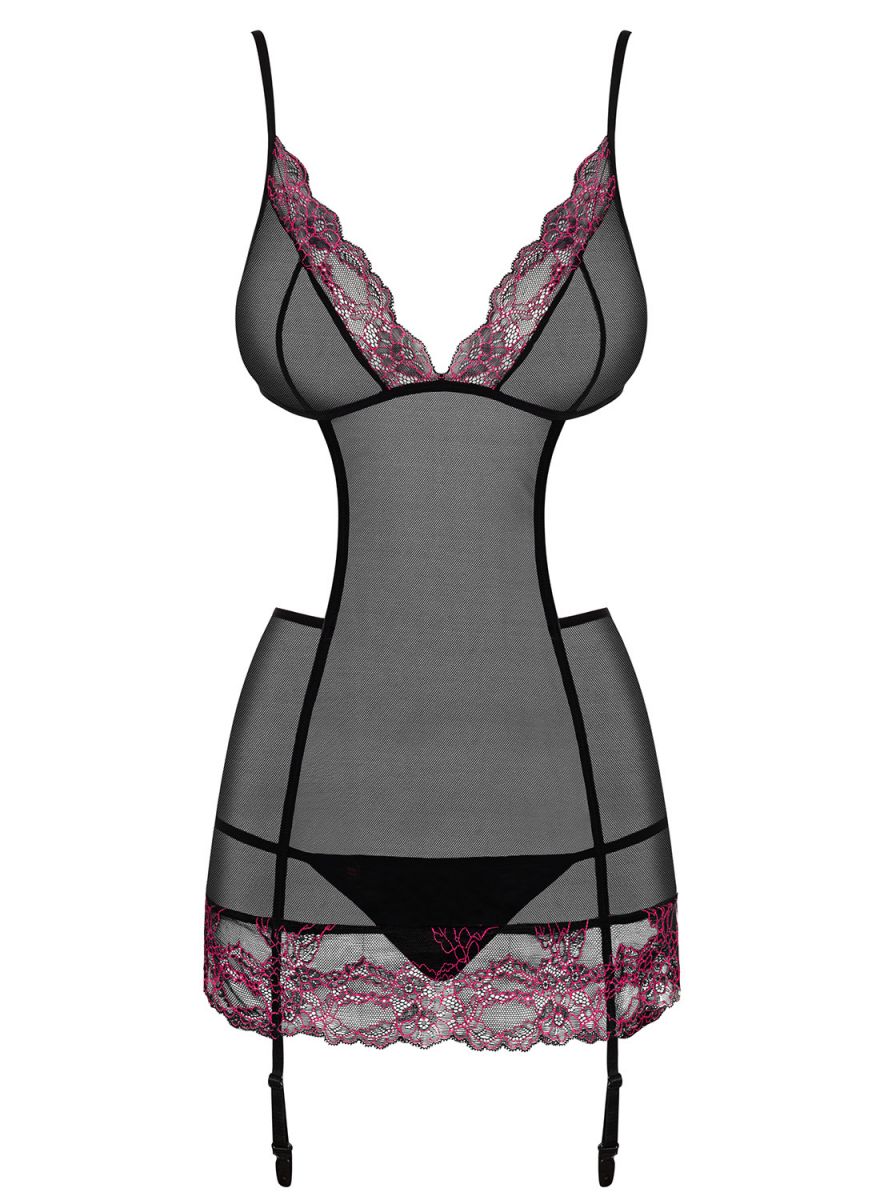 Сорочка и трусики из полупрозрачного материала, зона декольте и низ украшены кружевом. Спина открытая. Застежка на двух крючках. Пажи для чулок регулируются по длине. В комплекте: сорочка, трусики-стринги.