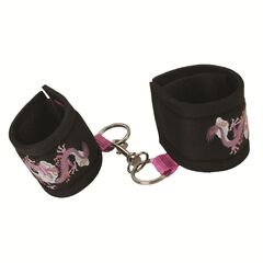 Мягкие поролоновые наручники с принтом татуировки в виде дракона. Размер наручников легко регулируется при помощи ленты-липучки, а удобные кольца с карабином позволят их использовать в различных позициях.