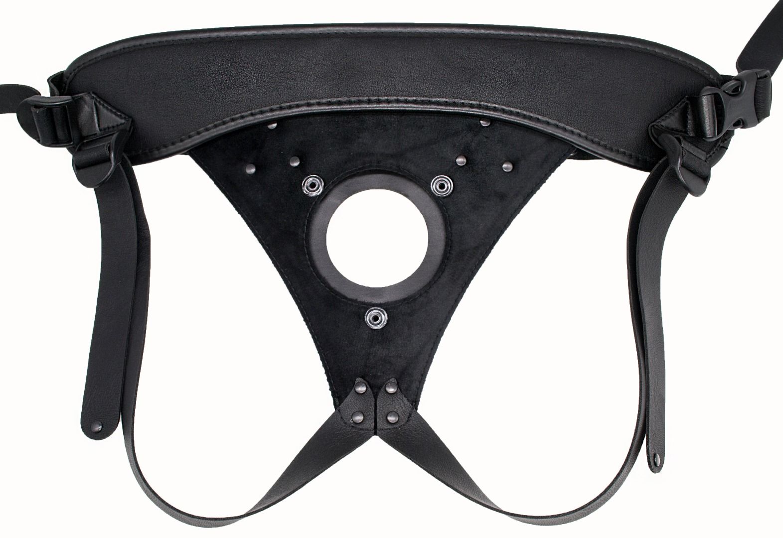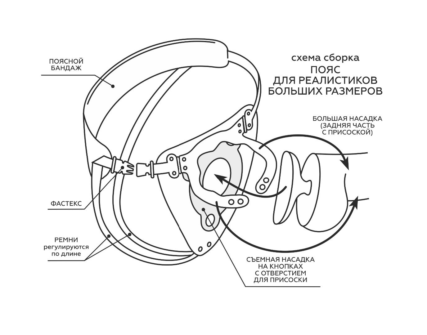 Пояс способен выдержать самый «солидный» размер насадки. Для этого проденьте насадку с присоской в отверстие. Присоска, соприкасаясь с телом, способна амортизировать нагрузки и даже присасываться к телу, дополнительно фиксируя изделие. В зависимости от размера снимите или оставьте съемное кольцо. И отрегулируйте «хомутик» с помощью кнопок для изменения диаметра по насадке-реалистику. Такой пояс можно использовать в очень широком диапазоне размеров.