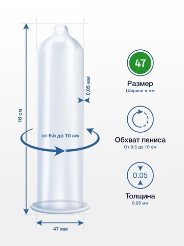 Идеальный размер презерватива? Идеальный размер, это размер, в котором комфортно именно тебе. Стандартные презервативы, которые «на всех один размер», некоторым людям бывают неудобны - они сидят или слишком туго, или слишком широко. Май Сайз - отличные немецкие латексные презервативы, которые предлагают целую линейку размеров, в которой есть презервативы, предназначенные для членов разных окружностей. Просто измерь один раз окружность своего бойца в эрегированном состоянии, и ты будешь знать, какой размер латексных презервативов My Size подходит именно тебе. Толщина - 0,05 мм.