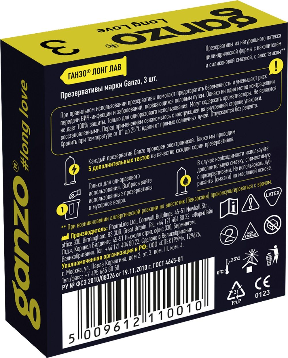 Прозрачные презервативы Ganzo Long Love цилиндрической формы с накопителем, силиконовой смазкой и бензокаином для пролонгирующего эффекта. Изготовлены из натурального высококачественного латекса. Проверены с использованием электростатической технологии для большей надежности.
