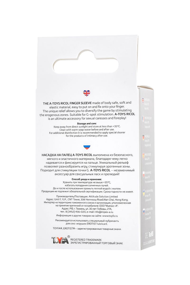 Насадка на палец A-Toys Ricol выполнена из безопасного, мягкого и эластичного материала, благодаря чему легко надевается и фиксируется на пальце. Уникальный рельеф позволяет разнообразить игру, стимулируя эрогенные зоны. Подходит для стимуляции точки G. A-Toys Ricol – незаменимый аксессуар для сексуальных ласк и прелюдий!