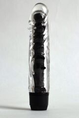 Черный вибратор, имеет реалистичную форму. Необычайно приятный, прозрачный материал, вибратор оснащен дополнительными пупырышками под головкой для особенных ощущений. Степень вибрации регулируется при помощи кнопки, расположенной в основании.