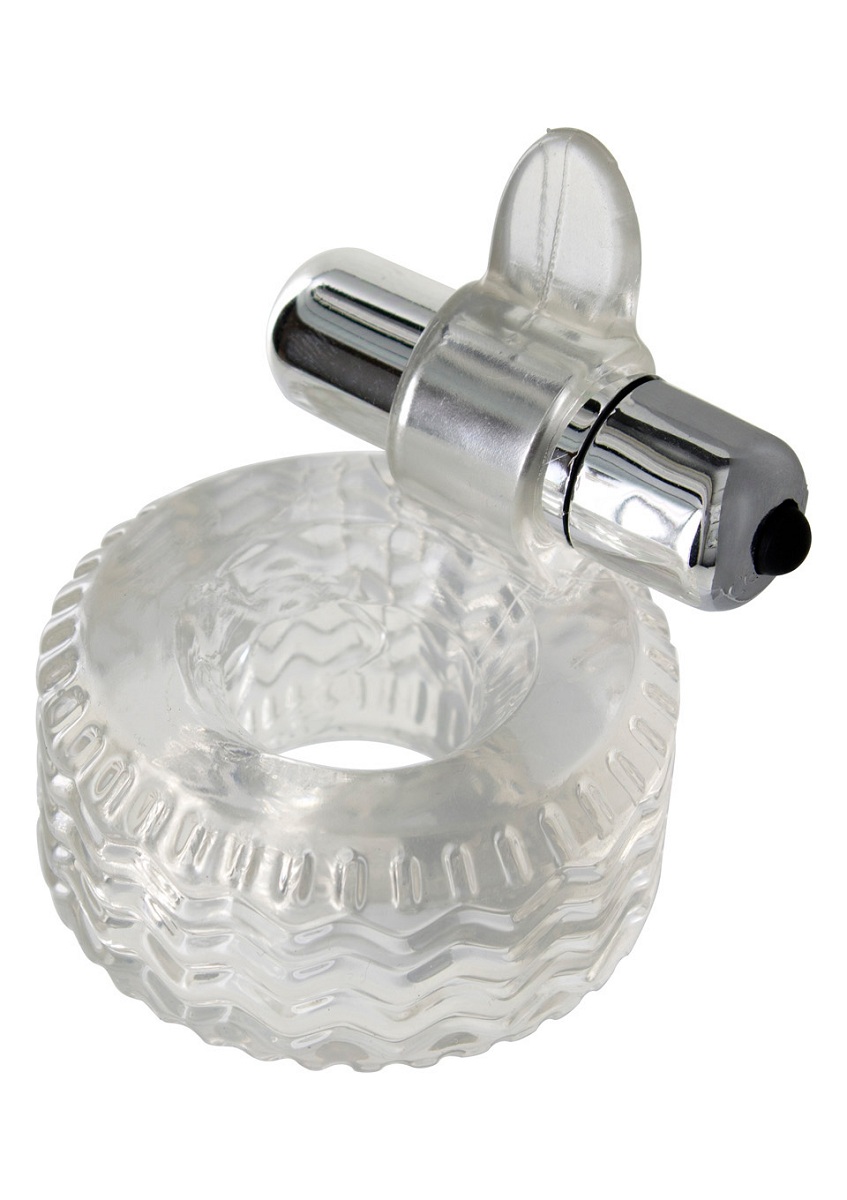 Эрекционное кольцо в виде шины. Рельефная поверхность обеспечит дополнительную стимуляцию партнерше, легко растягивается до нужного диаметра. Вибрация осуществляется при помощи вибропули, которая удобно расположена в петле у основания кольца (батарейки в комплекте).