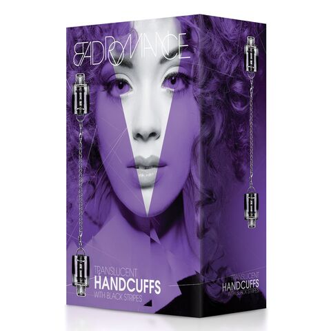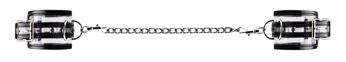 Прозрачные наручники с черными лаковыми вставками, изготовленные из ПВХ. Размер оков регулируется при помощи застежек. Соединены между собой цепью с карабинами. Ширина оков - 6 см.