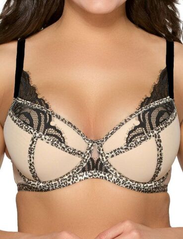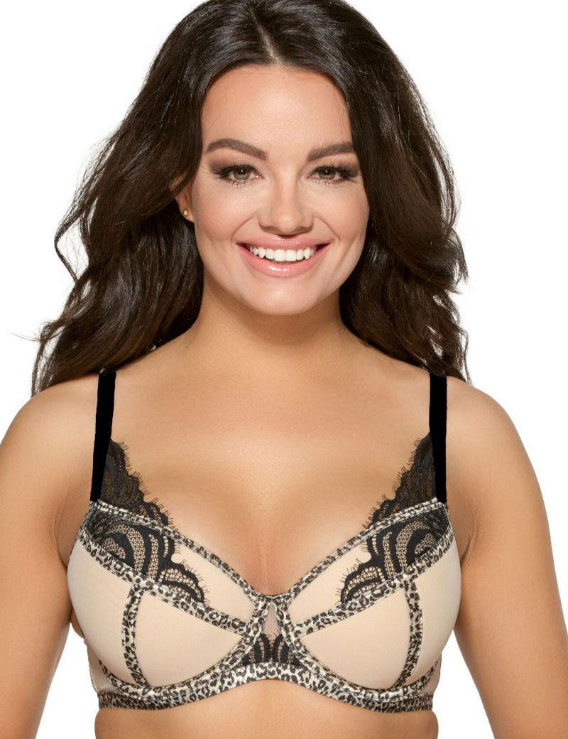 Бюстгальтер выполнен на косточках, чашки шитые из тонкого поролона телесного цвета, со съемными пуш-ап вкладышами, снаружи покрыты телесной сеткой, верхняя часть с чёрным кружевом, резинки и ленты на косточках и швах чашек с леопардовым принтом, бретельки контрастного черного цвета не отстёгиваются, регулируются по длине. Спинка из плотной телесной сетки. На спине застёжка на удлинитель, количество крючков в ряду застёжки увеличивается пропорционально размеру бюстгальтера. Фурнитура металлическая цвета желтого золота. У бюстгальтеров/купальных лифов AVA довольно тугой пояс, который адаптируется под тело после нескольких дней носки или одной-двух стирок. Рекомендуем использовать удлинитель пояса бюстгальтера на первое время либо выбирать следующий за «своим» размер, с поясом длиннее.