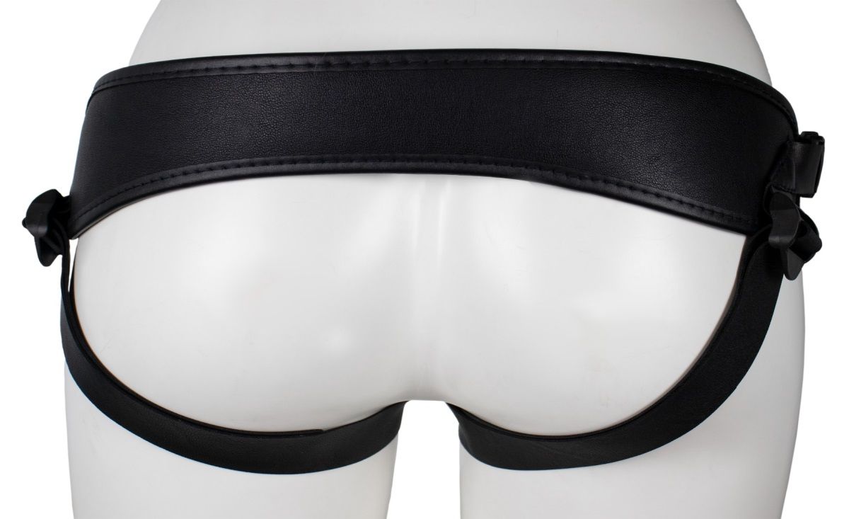 Введение полового члена возможно обеспечить в пустом эластичном каркасе. Каркас (пустотелый фаллоимитатор) зафиксирован на поясе. В платформе пояса имеется треугольное отверстие для мошонки. Харнесс имеет регулировки натяжения строп, плотную посадку, бандажный пояс и, что очень важно – фастекс. Это расстегивающаяся пряжка позволяет мгновенно снять пояс и продолжить половой акт в естественном режиме. Если эрекция не достигает нужной величины, то страпон обеспечит всю продолжительность интимного контакта. Рабочая длина - 15 см.