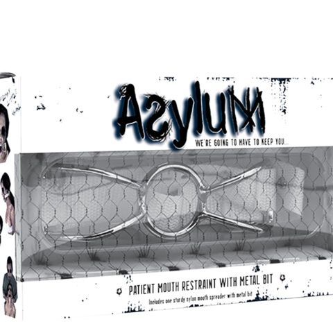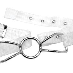 Расширитель рта с регулируемым шейным ремешком Asylum Patient Mouth Restraint with Metal Bit. Металлическое кольцо крепится на голове с помощью нейлоновых ремней. Ширина - 3,2 см.
