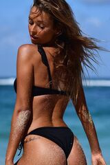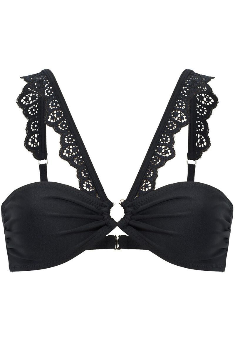 Раздельный купальник. Бюстье без вставок, лямки сделаны из кружев, имеются металлические кольца, на спине застежка. Трусики декорированы кружевом и металлическими кольцами, завязываются по бокам. В комплекте: бюстье и трусики.