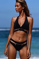 Раздельный купальник. Оригинальный фасон с декоративными молниями. Верх купальника мягкий треугольник без уплотнения. Завязывается на шее, на спинке застегивается. Трусики с разрезами по бокам. В комплекте: лиф, трусики.