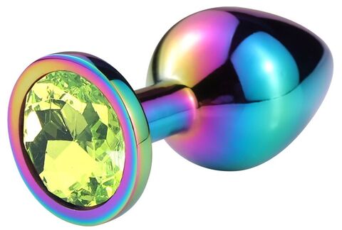 Разноцветная гладкая анальная пробка с салатовым кристаллом - 9,5 см.