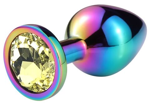 Разноцветная гладкая анальная пробка с желтым кристаллом - 8 см.
